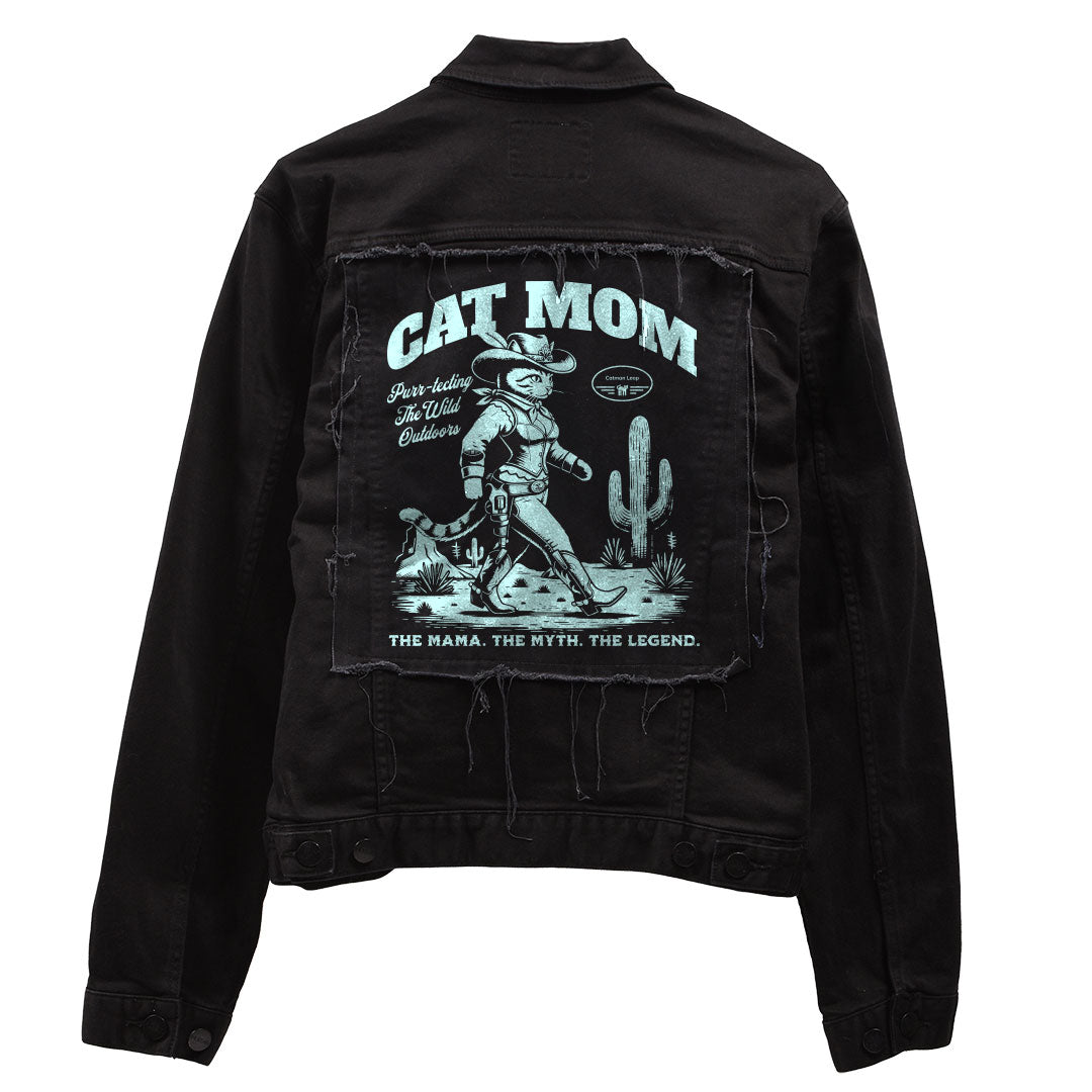 LIMITED EDITION COLLABORATION - Cat Mom Denim Jacket features raw edged denim appliqués hand printed with our Cat Mom motif, sewn in studio & given a destroyed look.